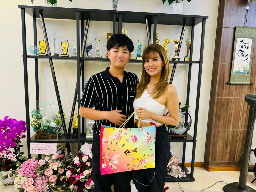 Buổi tối cùng ngày, Băng Châu hạnh phúc trong vòng tay thân yêu của gia đình. Món quà sinh nhật đơn giản nhưng dễ thương của cậu con trai tặng mẹ khiến người mẹ xúc động muốn rơi nước mắt. Tuy mới 14 tuổi nhưng cậu bé đã cao đến 1,78m, có…gene người mẫu của mẹ!