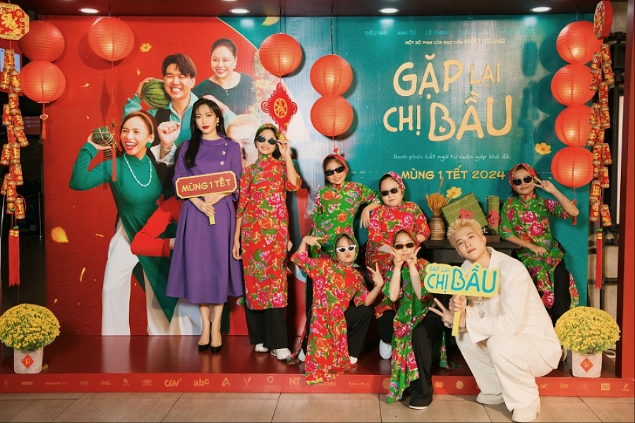 Chiều 15/1, đoàn phim Tết 2024 Gặp Lại Chị Bầu của đạo diễn Nhất Trung đã có buổi showcase tại TP HCM với sự tham gia của dàn cast chính - Anh Tú, Diệu Nhi, Lê Giang, Ngọc Phước, Quốc Khánh cùng đạo diễn Nhất Trung. Tại sự kiện, ê-kíp đã tái hiện một phần không khí Sài Gòn thập niên 90 với tiệm băng đĩa, quầy cafe vợt hay tiệm tạp hóa bày bán những món ăn tuổi thơ, gắn liền với ký ức của biết bao thế hệ. Khác với vẻ đằm thắm, dịu dàng trên thảm đỏ, khi mở màn showcase, Diệu Nhi bất ngờ ôm bụng bầu cùng dàn cast nhảy vũ đạo vui nhộn của ca khúc nhạc phim Tết đến rồi.