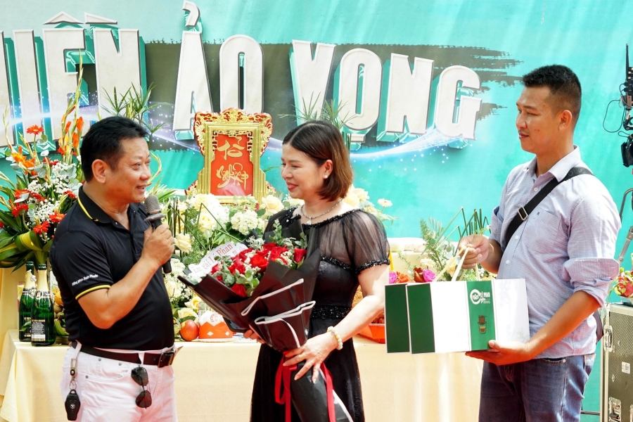 Chủ nhân thương hiệu Coffee Lý Phan từ Cần Thơ lên tặng quả cho đàon phim cầu may mắn