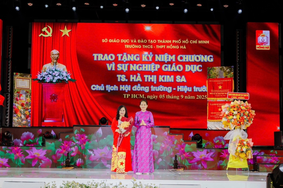 Đặc biệt, buổi lễ còn chứng kiến một khoảnh khắc vô cùng thiêng liêng và xúc động khi Nhà giáo – Tiến sĩ Hà Thị Kim Sa, Chủ tịch Hội đồng Trường, Hiệu trưởng Trường THCS – THPT Hồng Hà, ngoài Huân chươngng Lao động hạng nhì, bà còn được trao tặng Kỷ niệm chương “Vì sự nghiệp giáo dục” – minh chứng cho cả một đời tâm huyết, cống hiến không ngừng nghỉ cho sự nghiệp “trồng người”.