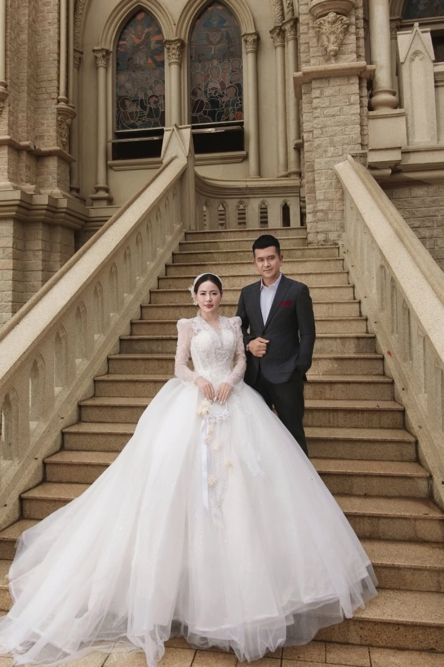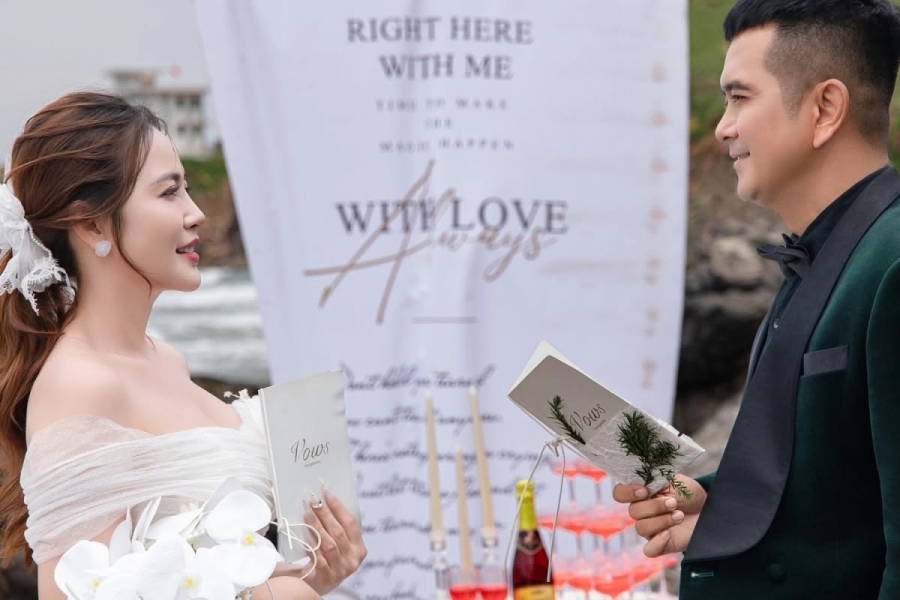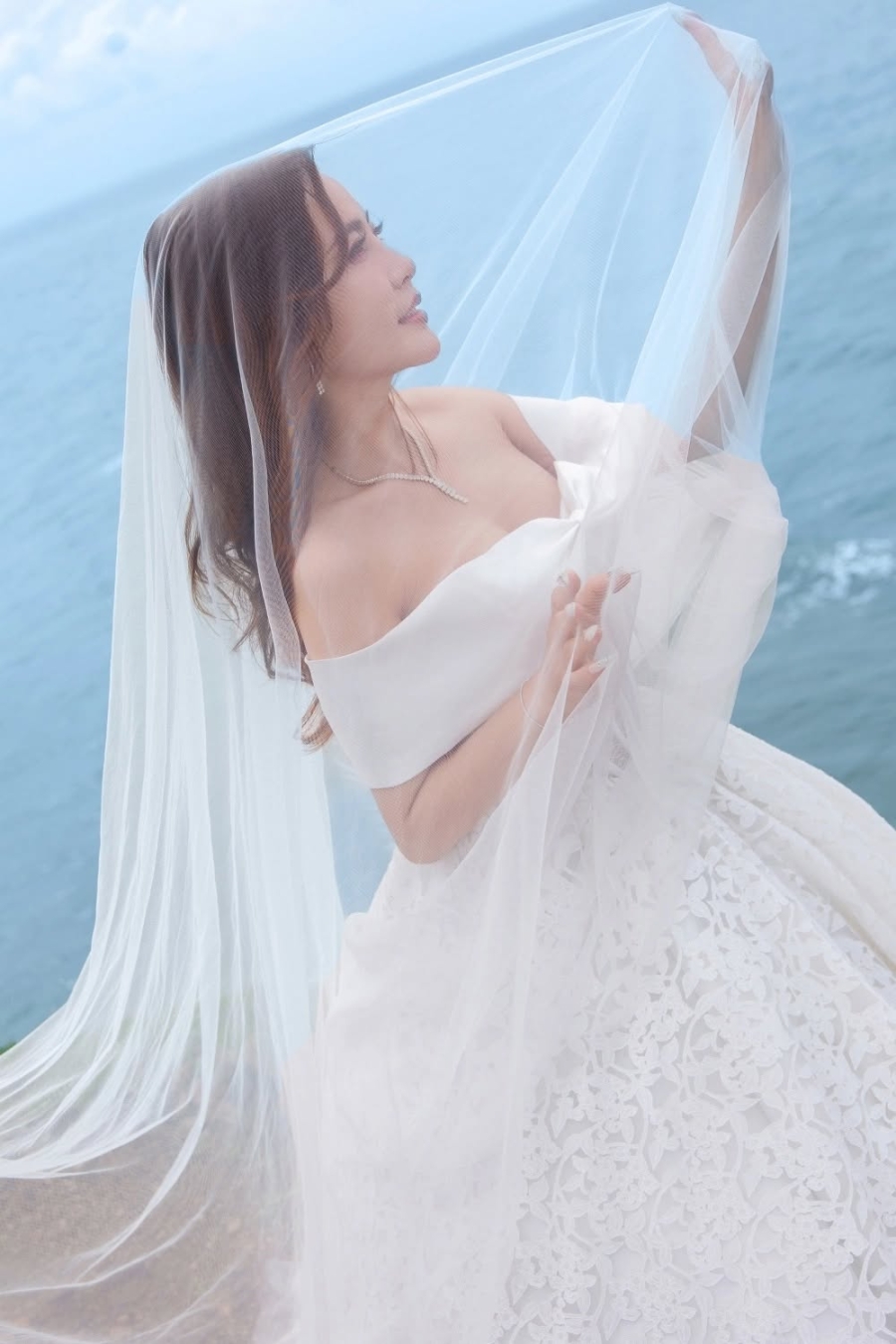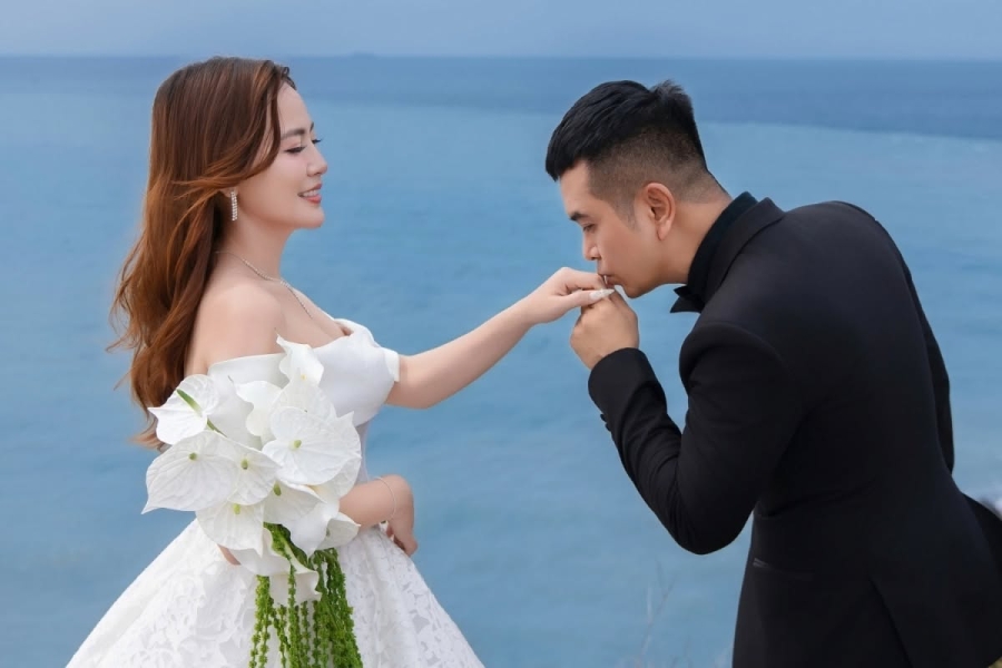 Chọn khung cảnh biển Hồ Cốc (Bà Rịa - Vũng Tàu) xanh mát, Hùng Thuận và Tuệ Tâm xuất hiện đầy ngọt ngào, hạnh phúc. Trong ảnh, Tuệ Tâm diện váy trễ vai thân bồng phối ren, khoe vẻ đẹp dịu dàng, tinh khôi. "Chúng tôi đã sẵn sàng cho ngày tuyệt vời nhất", nam diễn viên xúc động chia sẻ.