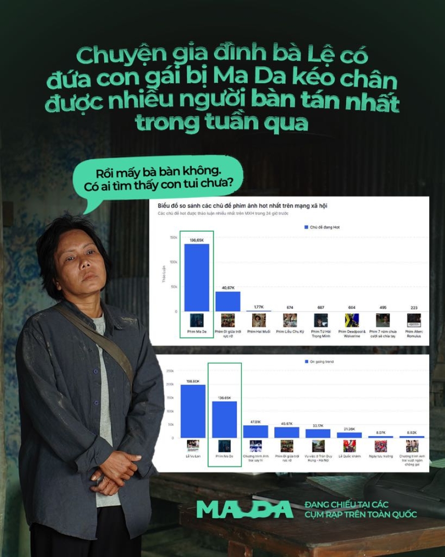 Bộ phim điện ảnh kinh dị, tâm linh Ma da được đạo diễn bởi Nguyễn Hữu Hoàng với sự tham gia của các diễn viên: NS Việt Hương, Dạ Chúc, NS Trung Dân, NS-NGƯT Diệu Đức, Duy Anh cùng các khách mời đặc biệt NSUT Thành Lộc, ca sĩ Cẩm Ly, NS Hoàng Mèo…, nhanh chóng đứng vị trí top đầu, lập nhiều kỷ lục mới cho dòng phim khá kén người xem ở thị trường Việt ngay suất chiếu sớm (15/8).