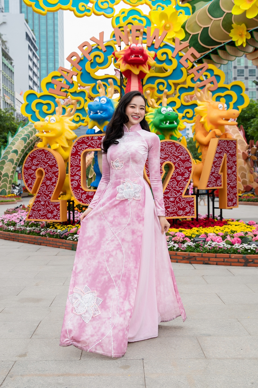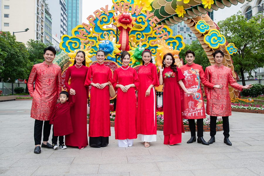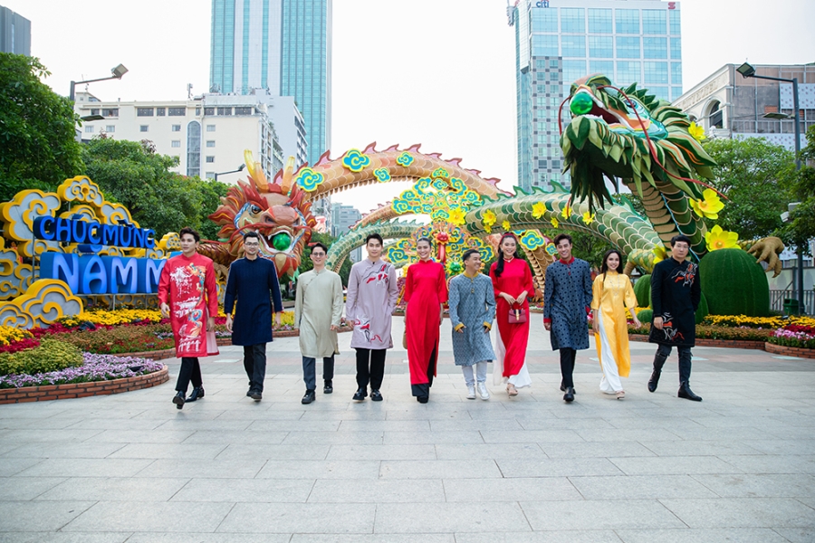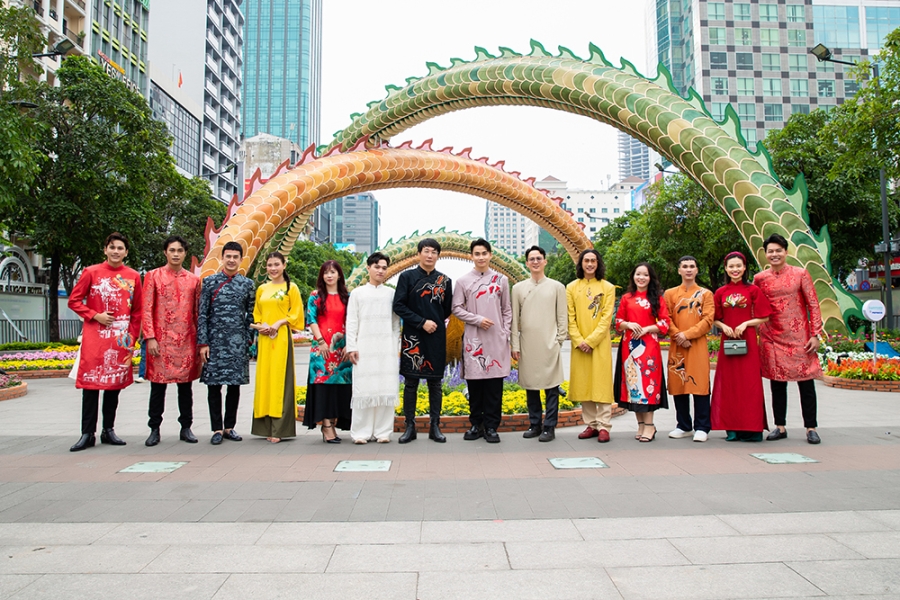 Để đón mừng xuân Giáp Thìn năm nay, các tà áo sẽ độc đáo với hình ảnh Tứ Linh uy lực đang tự do bay lượn trên những địa điểm đặc trưng của Việt Nam.