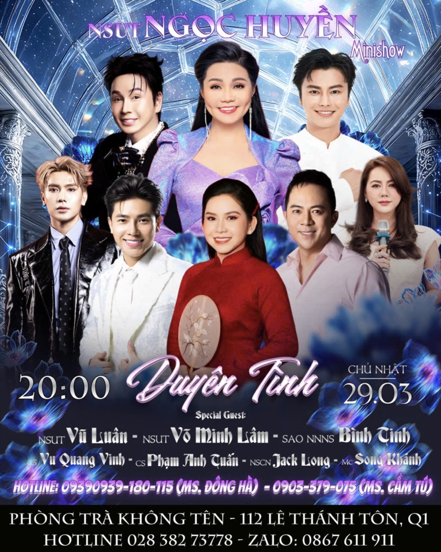 Vào lúc 20 giờ ngày 29/3 tới đây, tại Phòng trà Không Tên, Phường Bến Thành (TP.HCM), NSƯT Ngọc Huyền sẽ chính thức hội ngộ khán giả trong đêm Minishow đặc biệt mang tên "Duyên Tình".