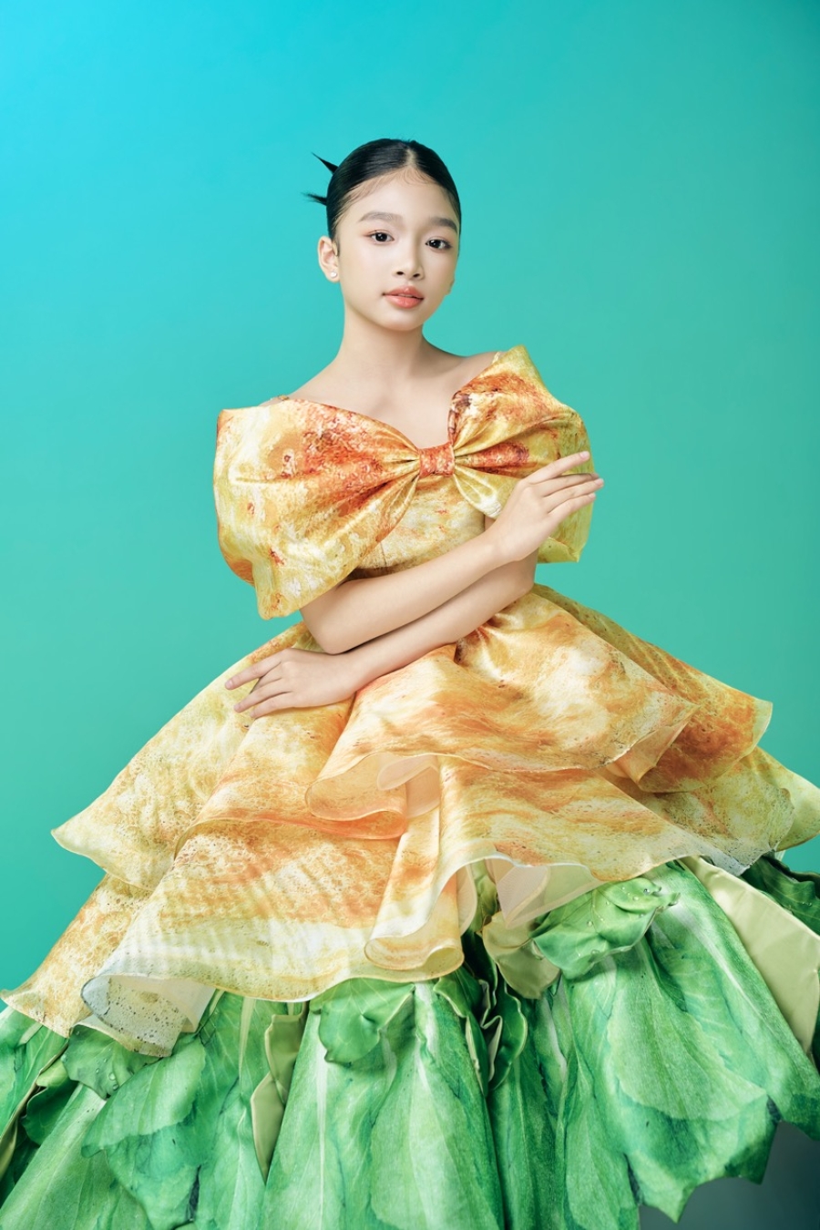 Thiết kế bánh xèo mang đến cảm giác gần gũi ngay từ cái nhìn đầu tiên. Tông vàng nghệ, vàng nâu được xử lý loang nhẹ gợi hình ảnh mặt bánh xèo vừa tráng, kết hợp sắc xanh lá ở phần chân váy như lớp lá lót quen thuộc trong ẩm thực miền Nam. Chi tiết vai trễ cùng nơ lớn bản rộng giúp tổng thể thêm mềm mại, tạo điểm nhấn thị giác rõ ràng nhưng không làm mất đi nét hồn nhiên của mẫu nhí.