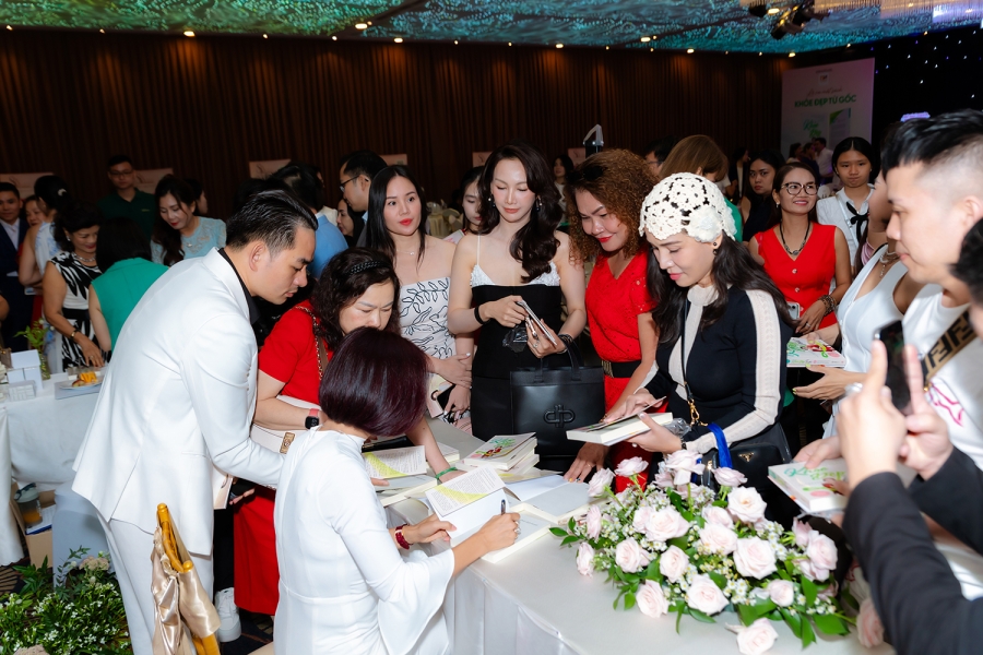 Diễn viên - Ca sĩ Lý Hương là những người tiếp theo đặt mua rất nhiều sách của TS. Nguyễn Thu Hương. Lý Hương cho biết: “Tôi đặt mua 20 cuốn. Tôi muốn dành nó cho người thân trong gia đình và bạn bè cùng đọc, tìm hiểu để áp dụng. Một cuốn sách viết dựa trên nghiên cứu khoa học và áp dụng thực tiễn với nhiều năm nghiền ngẫm, tích lũy và trải nghiệm như “Khỏe đẹp từ gốc” của TS. Nguyễn Thu Hương là rất ý nghĩa và cần thiết”. Không chỉ mua sách với số lượng nhiều, Diễn viên - Ca sĩ Lý Hương còn xếp hàng đợi TS. Nguyễn Thu Hương ký tặng và chụp ảnh chung lưu niệm trong sự vui vẻ đầy phấn khởi mặc cho những cuộc gọi liên tục từ công việc hối hả.