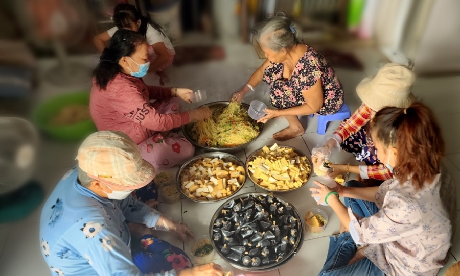 Trở về cái bếp đặt ở giữa đường đi, các chị bếp đang tất bật với chuyện xào mì, luộc cải, chiên tàu hủ. Bên trong là ngôi nhà chật hẹp với nhóm người đang miệt mài cho mì vô hộp, người làm bao nước tương, rưới đậu phộng nên việc hoàn thành 400 - 500 phần ăn cho mỗi lần là cả một công trình nấu nướng của nhiều người chứ một mình chị Kim thì kham không nỗi. Hầu hết những người đến đây đều với tinh thần tương thân, tương ái và không khí luôn rộn tiếng cười vang.